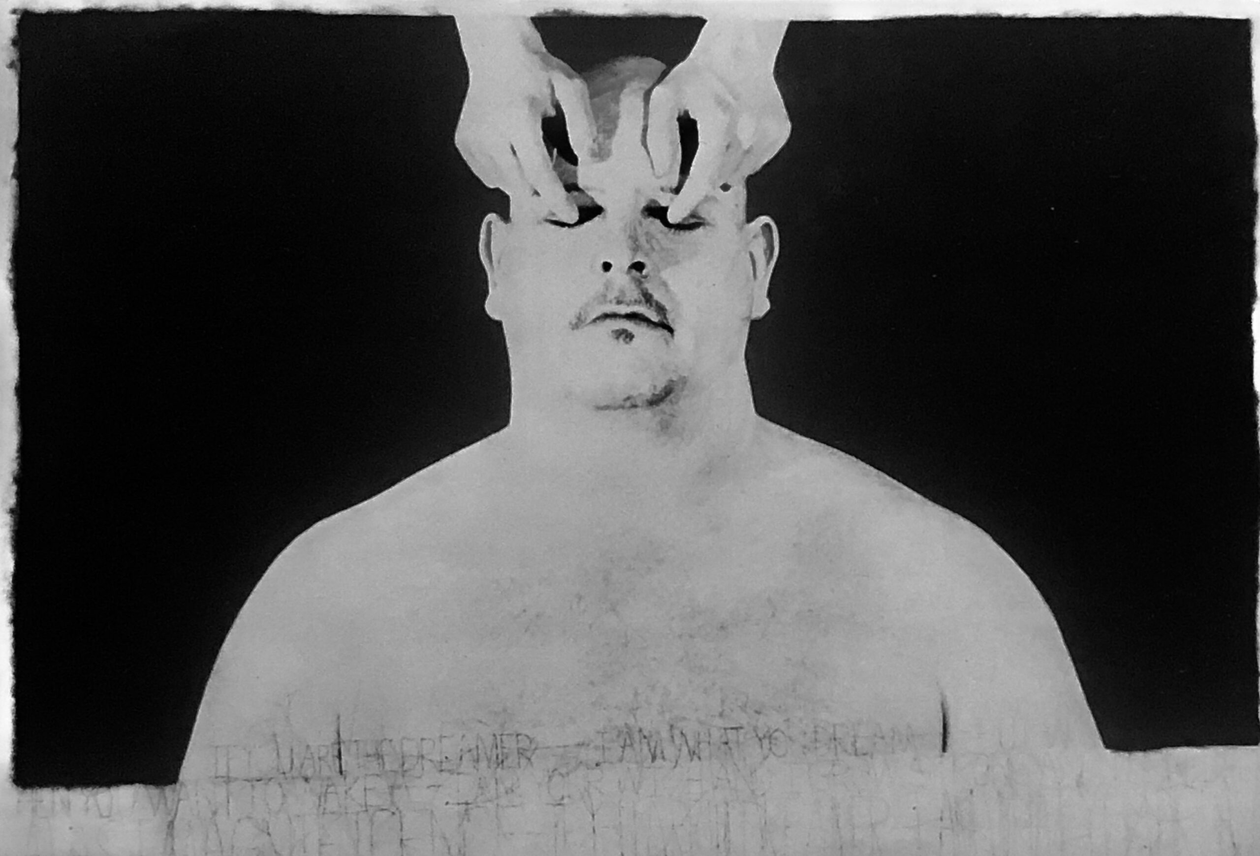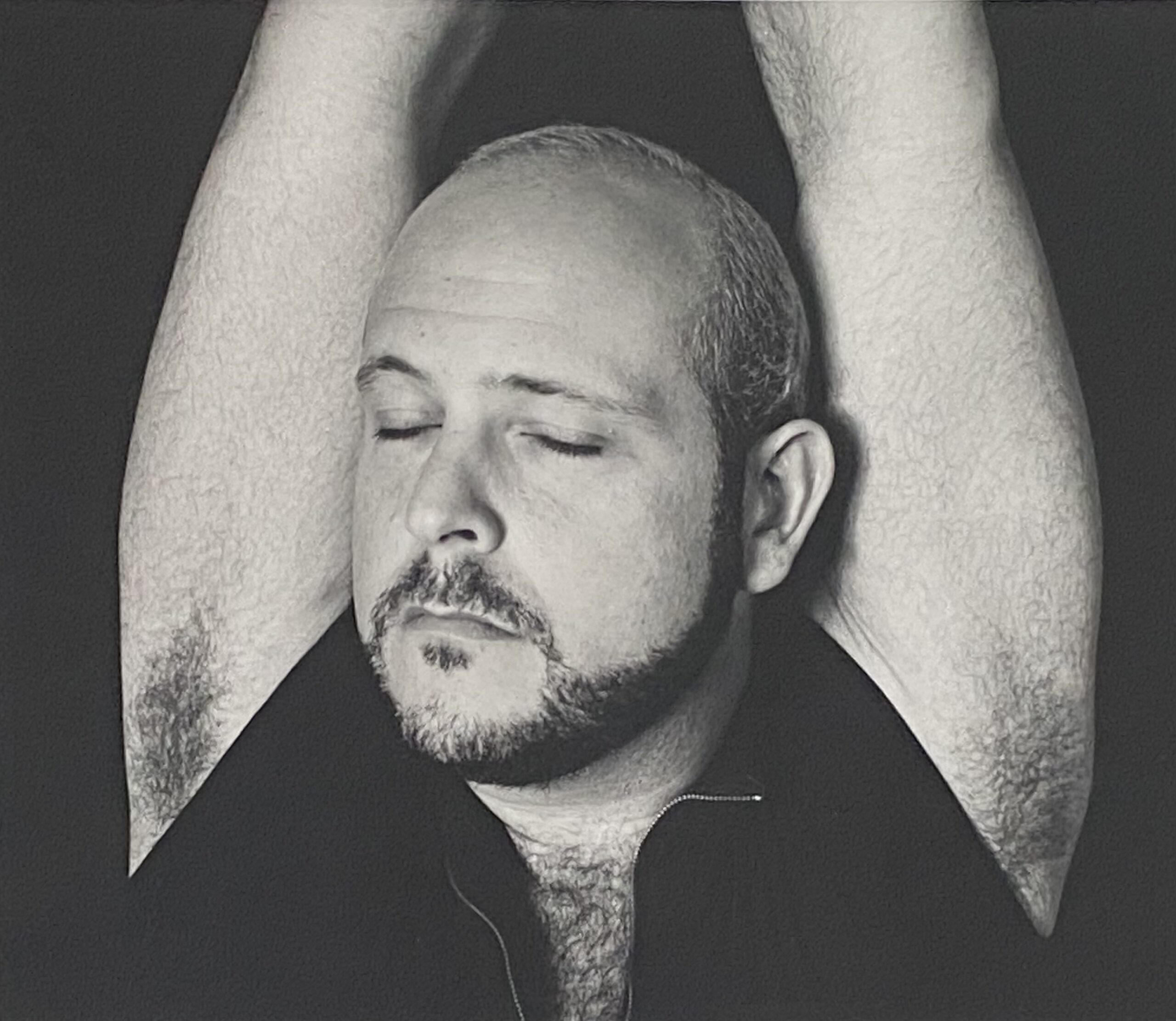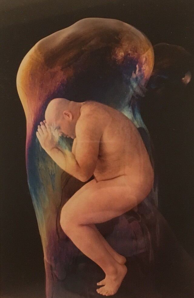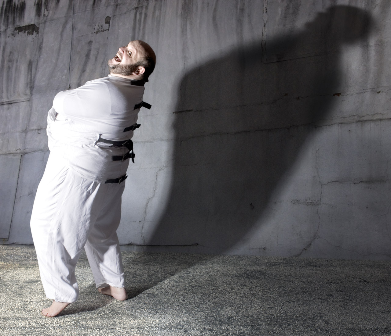 In Too Much Too Little (part I) the focal point of the piece is the insecurities regarding the physical characteristics of the performers. Goldhuber appears in a costume that nearly doubles his size while Latsky stands on stage confined by her arms stretched to the ceiling by flesh toned fabric. Performing movement from a ballet vocabulary, Latsky comments on the body types society expects from a particular style and range of movement. While Latsky’s commentary comes from her movement, Goldhuber’s commentary comes from his lack of movement.