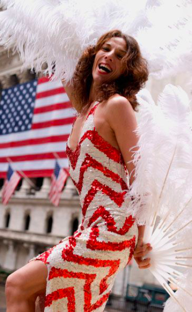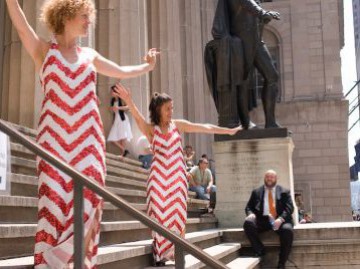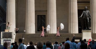 Goldhuber regards Whose Broads Stripes as a pageant of sorts (props include fake money and famous protest signs like War is not healthy for children and other living things). But there is also a subversive edge, made more meaningful by the piece’s dramatic setting: the steps of the Federal Hall National Memorial, with the Stock Exchange and military presence nearby. “When Patty [Hoffbauer] first started rehearsals, she said, ‘Oh, it’s very political,’_” Goldhuber recalls. “I’m like, Barely. In the most generic way: Make love, not war. It seems so tame, almost like a cliché. I often use what I consider shorthand in my work, which is simple. I’m a fan of ballet, which helped me realize that doing four things on the left and four things on the right-that repetition-is okay. It gives me confidence. I can invent movement, but that’s not what interests me in putting on theater. I love Merce Cunningham, so it’s not that I don’t like that as an aesthetic; it’s just that it’s not funny.”